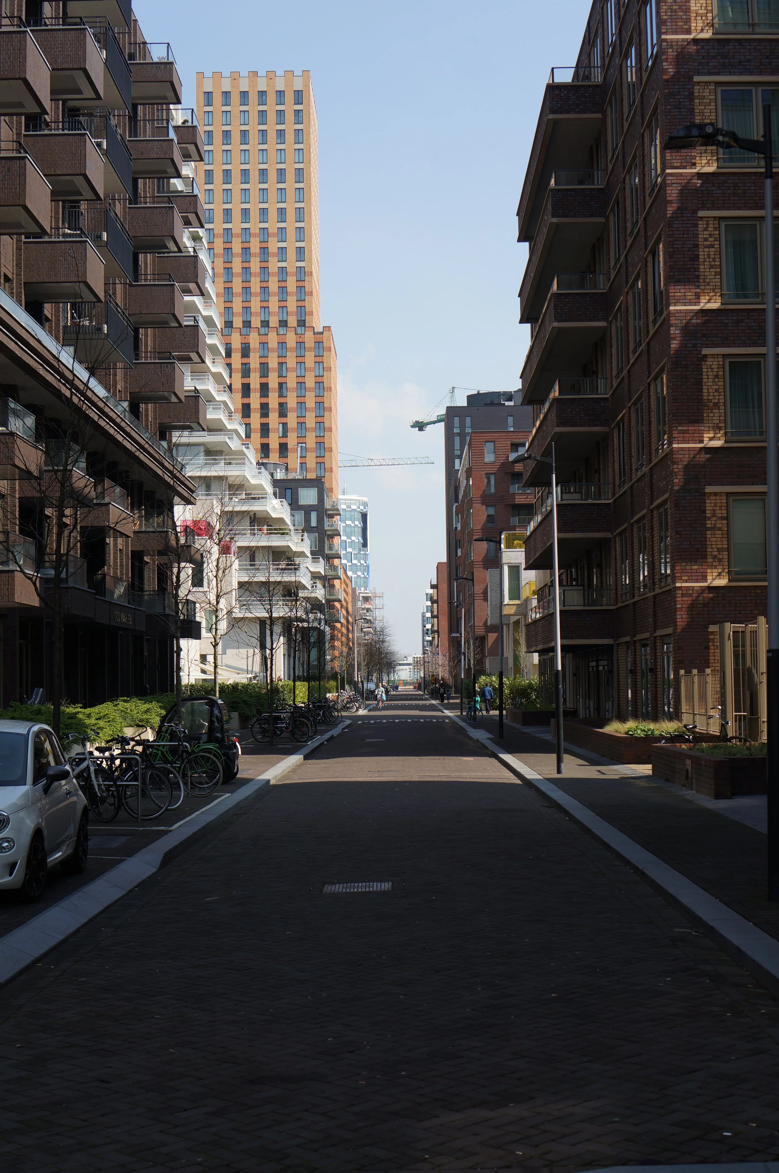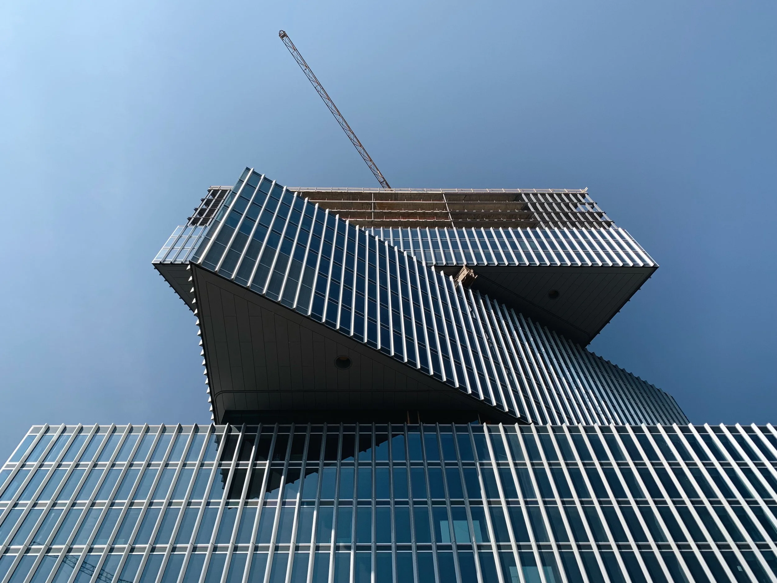 A super sunny day in Amsterdam called for a good sesh of exploration throughout the city’s outer ring and all of it’s architectural treats. I set off towards Amsterdam RAI station to catch a glimpse of OMA’s latest hotel tower under construction. The week before my arrival the NHow Hotel project - situated next to the Amsterdam Convention and Exhibition Centre - had celebrated it’s tree-topping ceremony, making me lucky enough to see the three-stacked-and-twisted volumes perching over the railway platform at their full height.